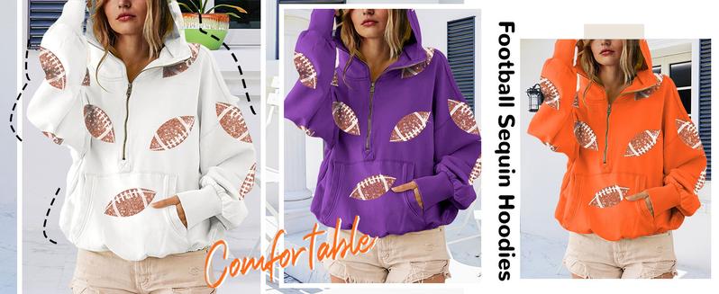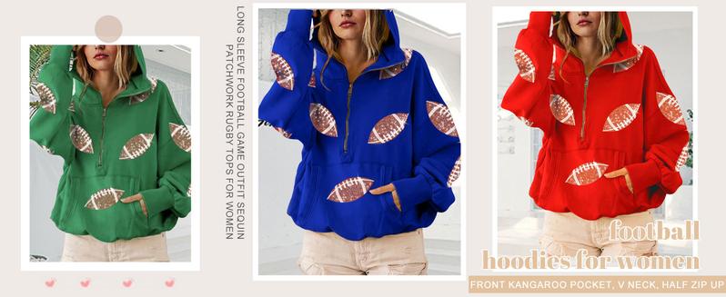 • 🔥 Hot Sale 49% OFF💥Womens Game Day Sweatshirts Football Sequin Hoodies Tailgate Outfits Long Sleeve Zipper Sweaters with Pocket