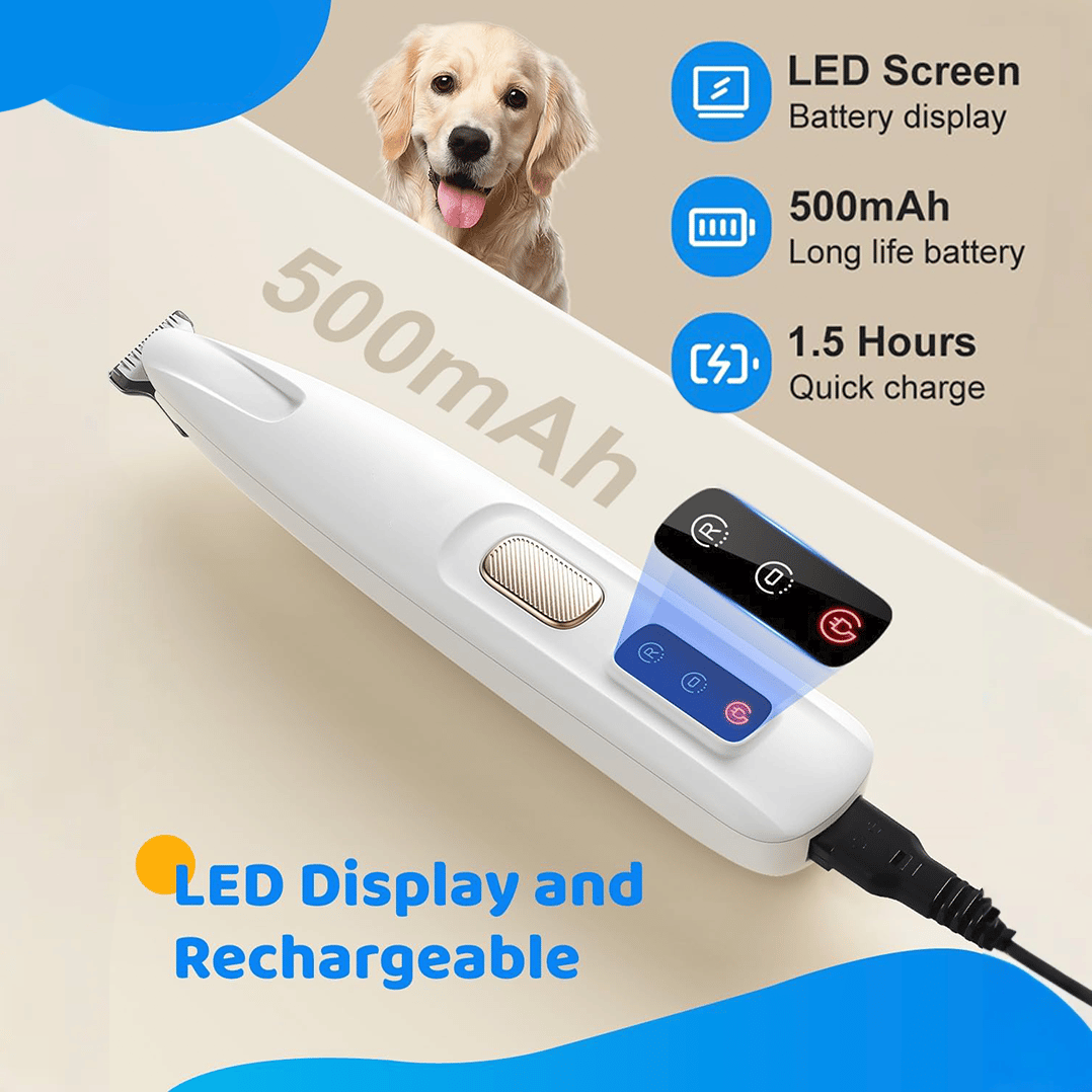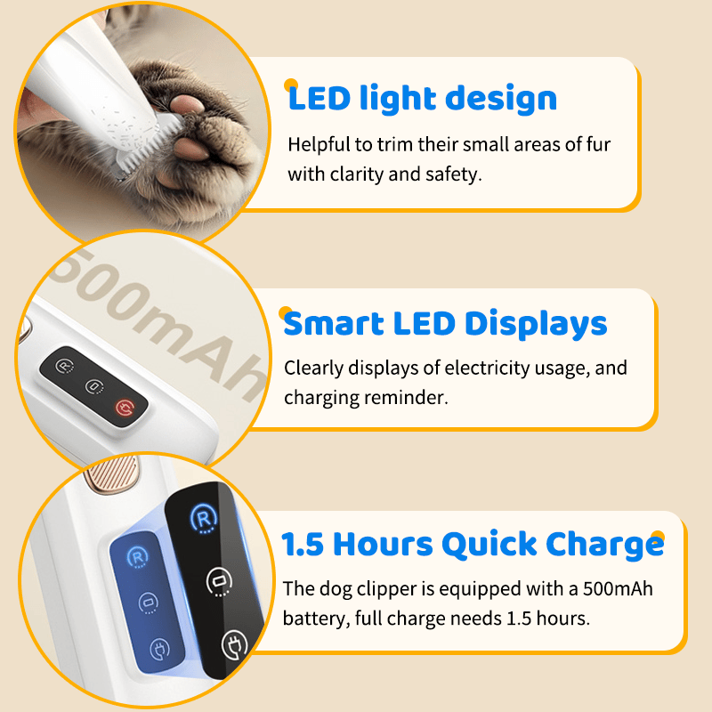 This dog paw trimmer is equipped with a smart LED screen that clearly displays 3 key statuses- Running, Full Charge, and Charging Reminder. The dog clipper is equipped with a 500mAh battery, so there are no worries about replacing batteries anymore. The quick charge needs 1.5 hours.